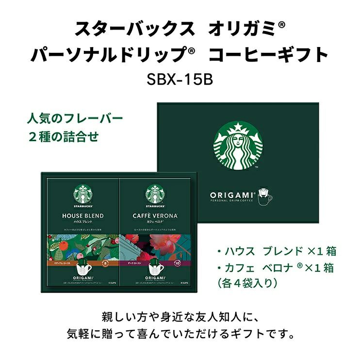 他の画像を見る スターバックス オリガミ パーソナルドリップ コーヒーギフト SBX-15B スタバ ドリップコーヒー ドリップ コーヒー 珈琲 歳暮 贈答 ドリンク ¥ 1,995 税込 詳細を見る お気に入りに登録する