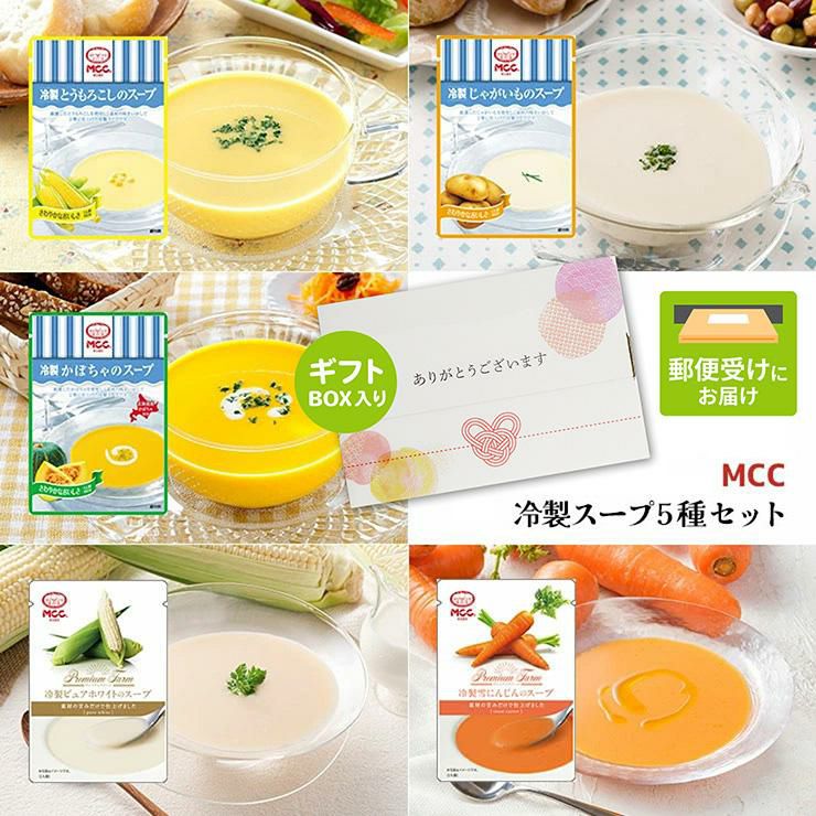 他の画像を見る プチギフト ●ありがとう● MCC 冷製 スープ 5種 アソート 160g 5袋 コーン じゃがいも かぼちゃ にんじん ギフト ゆうパケット メール便 ¥ 1,800 税込 在庫切れ 詳細を見る お気に入りに登録する