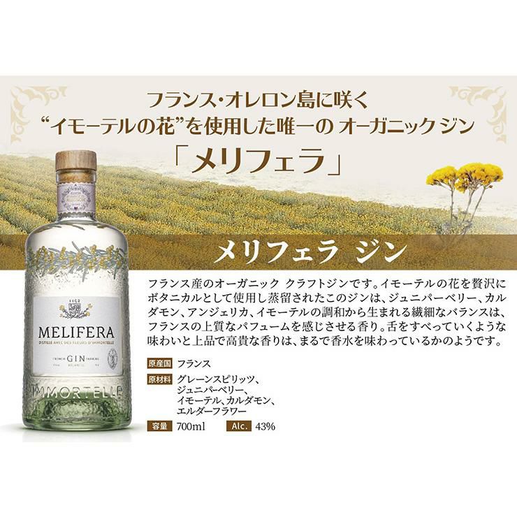 他の画像を見る オーガニック メリフェラ ジン 700ml フランス スピリッツ フレンチジン イモーテル プレミアムジン 43% MELIFERA ¥ 6,700 税込 詳細を見る お気に入りに登録する